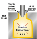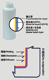 氟化瓶是在普通HDPE塑料瓶的制造過程中增加了一道氟化工藝,用氟、氮混合氣體在特殊吹塑設備上進行吹塑,使得經過氟化處理的容器壁比未經過氟化處理的容器內壁上多了一層以PTFE(聚四氟乙烯)為主的物質,與普通塑料瓶相比,氟化瓶能有效防止有機溶劑的滲透和產品降解。是您盛裝農化、香精香料、食品、油墨助劑及其它化工產品的首選。